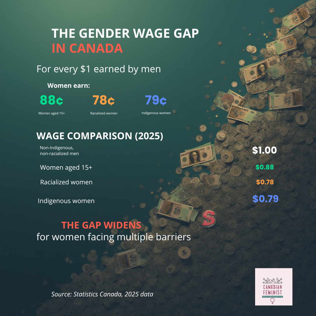 According to the most recent Statistics Canada data, women aged 15 and over earned 88 cents for every dollar earned by men in 2025, with the gap widening significantly for many groups of women.